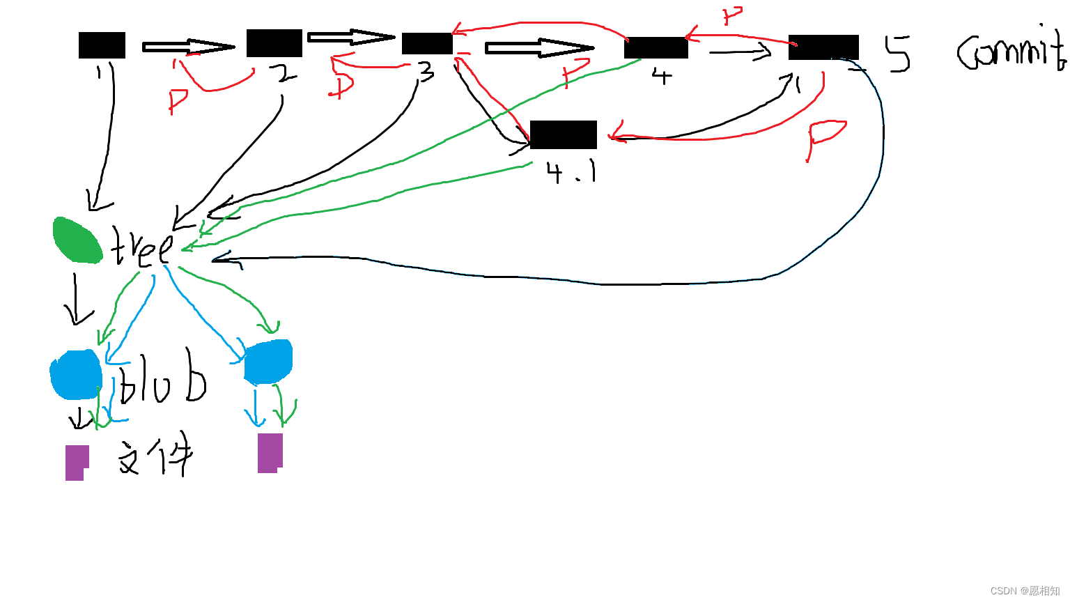 1.首先先生成一个commit文件,这个文件保存了我们本次提交的信息,提交者,内容等等,然后我们的内容对应的key指向我们下一层级的文件----tree。