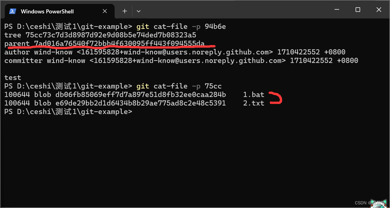 而我们的tree中,不但有我们提交的2.txt,甚至还有1.bat,并且复用了哈希码,这里我们可以得出结论,在我们的多次提交中,没有改变的文件的指针会进行不断复用同一份储存,不需要进行多次拷贝。