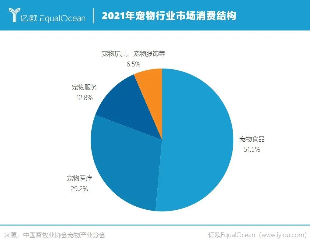 中国畜牧业协会宠物产业分会数据显示,2021年宠物行业市场消费结构中,宠物食品产业占市场的51.5%,宠物医疗产业占市场的29.2%,服务产业包括宠物寄养、宠物美容、宠物婚丧等占据市场的12.8%,另外还有宠物玩具、宠物服饰等领域占据6.5%。