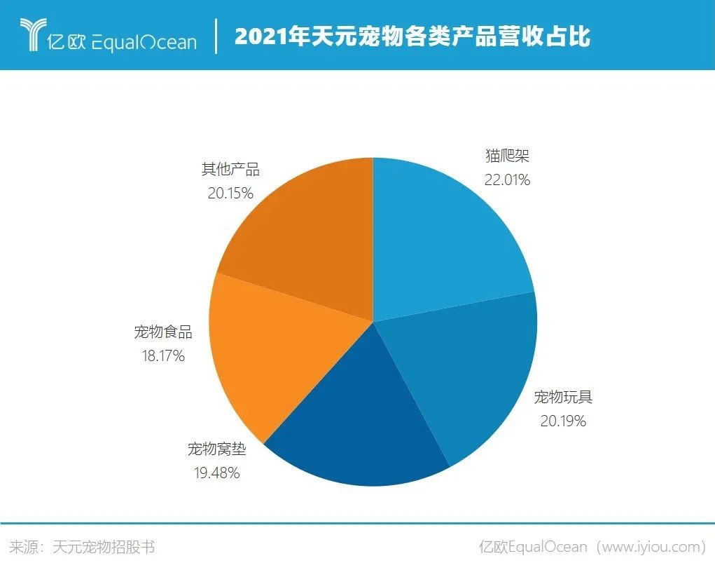 猫爬架和宠物玩具和是天元宠物的主要产品,收入加起来占到总营收的近半壁江山。以2021年为例,其第一大品类猫爬架占主营收入的22.01%,其次为宠物玩具占20.19%,宠物窝垫和宠物食品的占比分别在19.48%和18.17%。