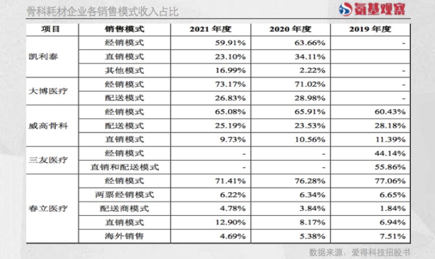 另一方面,集采降价还会间接影响出厂价。骨科耗材国内外企业均采用经销商模式销售。如下图所示,2021年包括大博医疗、凯利泰、爱得科技在内的公司,经销收入占比均不低。