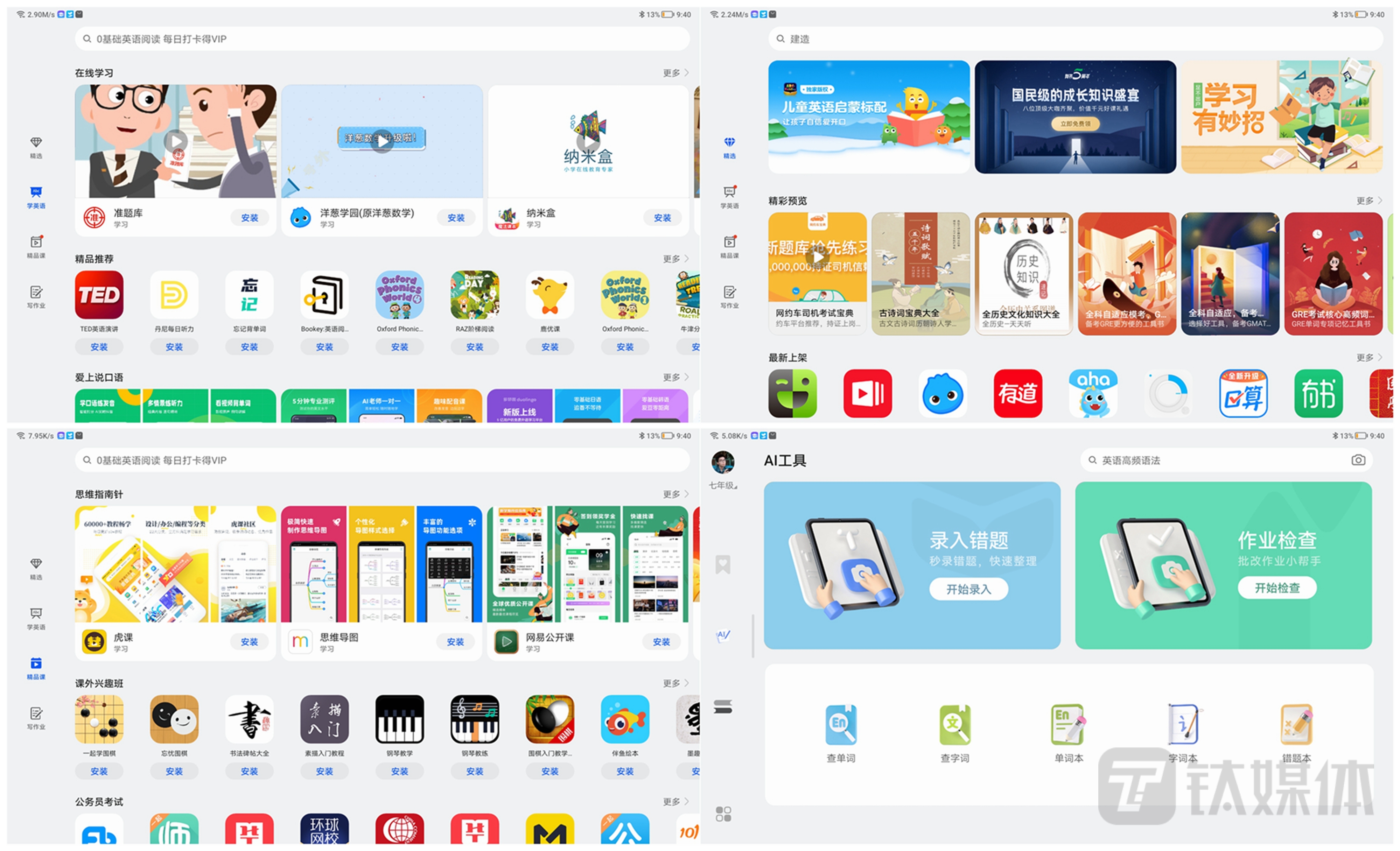 功能方面,产品搭载了最新的Magic UI 6.1,系统内可以看到教育中心,这里就是为K12教育服务的地方。除了可以看到各种课程、习题,还能借助机身搭载的500万像素后置摄像头进行作业、错题检查,应用中还提供了独立的应用中心,里面都是与学习相关的应用,退出应用时还需要输入密码,因此可以让孩子将平板电脑作为真正的学习工具使用。