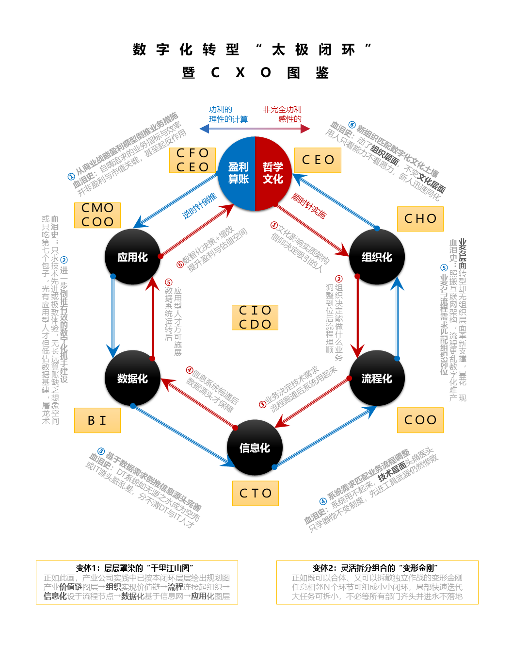 沿着旧地图,找不到新大陆。希望这个闭环暨CXO图鉴,能让大家更清晰地看到数字化转型的“排兵布阵图”,掌握合力让企业数字化转型这个大盘转起来的方法,也希望有更多加入到完善这个闭环的事业中来,太极生两仪、两仪生四象,这个母体可以演变出不同细分版本,最终实现企业成功转型的美好未来。