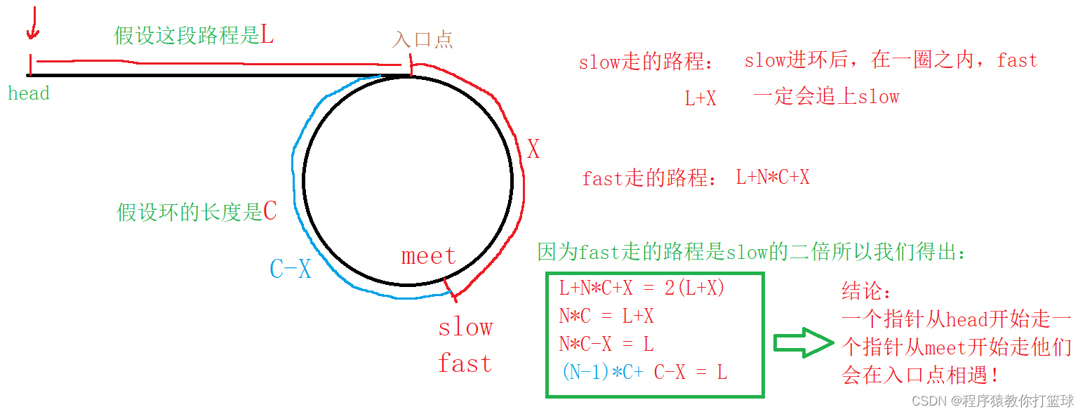 ** 思路:**我们还是用跟上面一样的快慢指针的方法,但是在后面,一个指针从相遇点meet开始走,一个指针从链表头head开始走,他们会在入口点相遇!图解,代码参考见下: