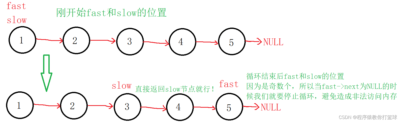 思路: 我们使用快慢指针的办法,快指针fast走两步,慢指针slow走一步,这样当fast走完了,slow指针就走到了中间的位置,但是我们要注意,如果链表节点为奇数个则当fast为NULL就应该结束循环,如果链表节点为偶数个则当fast->next为NULL则结束循环!思路解析,代码实现如下: