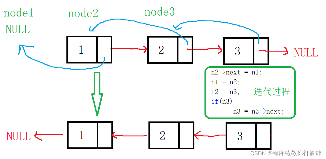 思路一: 翻转指针方向,首先我们要有三个指针,这个就不展示代码了,逻辑过程如下: