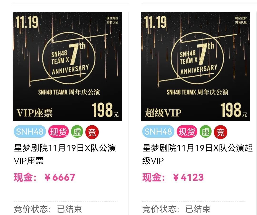 美踏控股(原丝芭文化)之所以在疫情下坚持线下演出模式,也是因为48系女团线下剧场的营收虽不如动辄过亿的总选来得猛烈,但靠着门票及周边的竞价模式、握手会、一日店员、生日公演、节日公演等活动,创造出一笔不菲的稳定收入。像是SNH48 Team X于11月19日举办的周年庆公演,就曾出现198元的VIP座票被竞价至6667元一张,198元的超级VIP门票也被以4123元拍下。