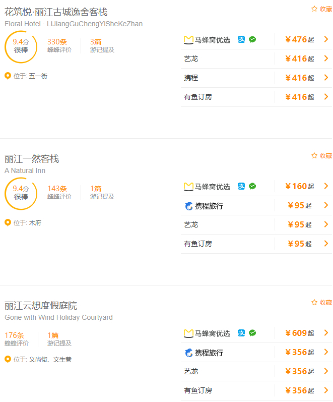 而在马蜂窝上搜索酒店,用户会发现官方渠道“马蜂窝优选”与来自携程、艺龙、Booking.com、有鱼订房等其他渠道的预订顺向排列,但被置顶的马蜂窝优选相较其他渠道并无明显优势,甚至价格上有些还会贵出几十乃至数百元。