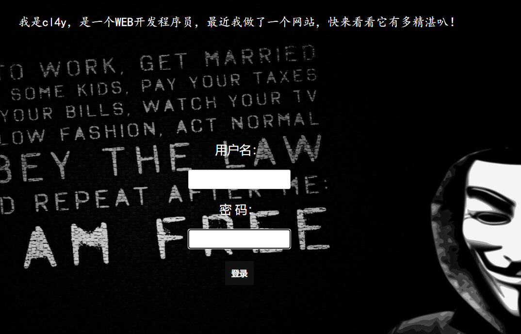 根据提示,用户名就是cl4y,密码试一试万能密码。出现flag