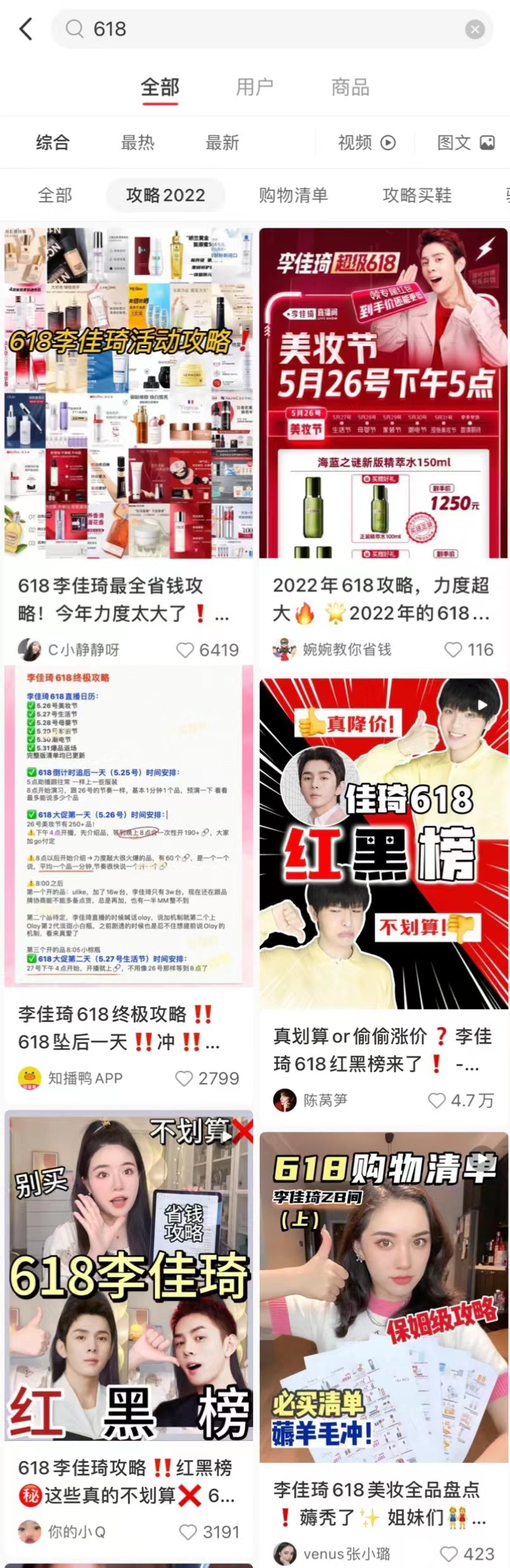 如果某品牌在618大促期间上了李佳琦的直播间,那在现在的预告期,搜索声量都会有一定的上涨。消费者比较感兴趣的就是购物清单的种草,不至于一个品牌、一个单品,且优惠方面的攻略比较需要一些有经验的博主整理。