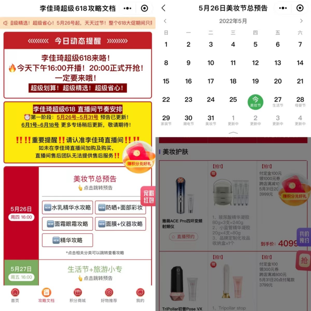 美妆是小红书种草的第一大赛道,也是李佳琦直播间的最大品类。作为购物决策前的必选平台,小红书的用户流量和618大促的节奏是同频的,因此小红书在618大促期间的特点,就是注意头部主播比如李佳琦的直播内容。