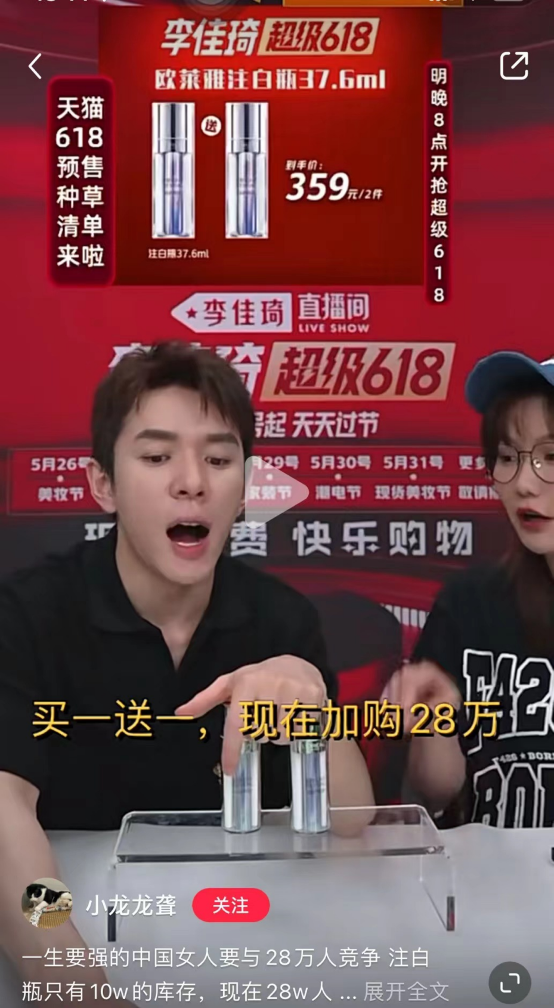 5月13日,李佳琦在618直播预告中展示了欧莱雅的爆款单品注白瓶,其官方天猫店售价439元,李直播间的价格是359元买一送一,并吆喝道:“它今年不火,我李佳琦把名字倒着写”。