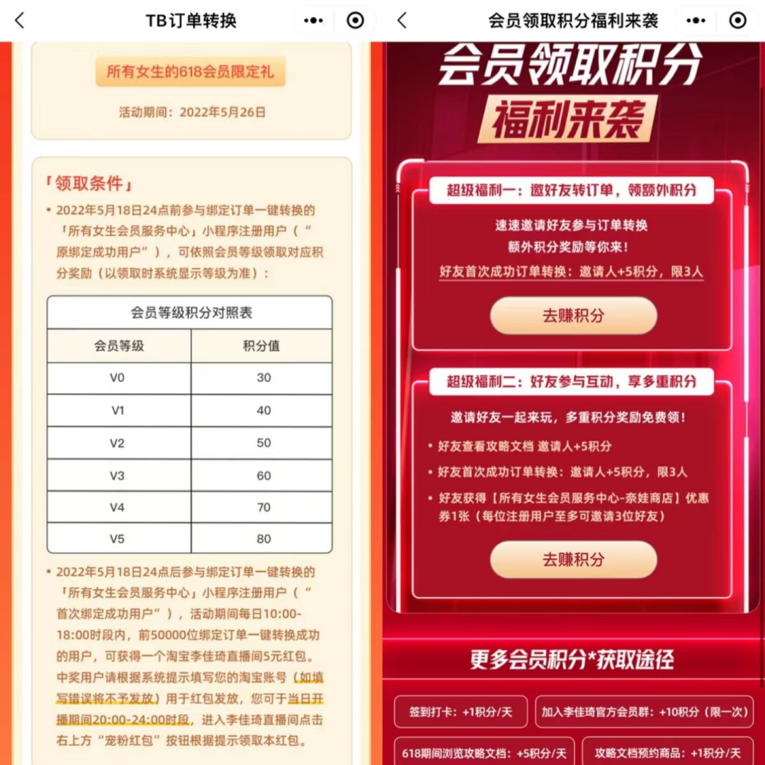 除此之外,小程序有消费者淘宝订单一键转化为积分,还有邀请好友查看618攻略领取积分,不仅可以把淘宝的粉丝引流到小程序,还能拉路人粉,精准积累客户,逐步积累数据资产。而和社群的结合,则可以积累私域流量和粉丝粘性,把公域的流量导进私域。
