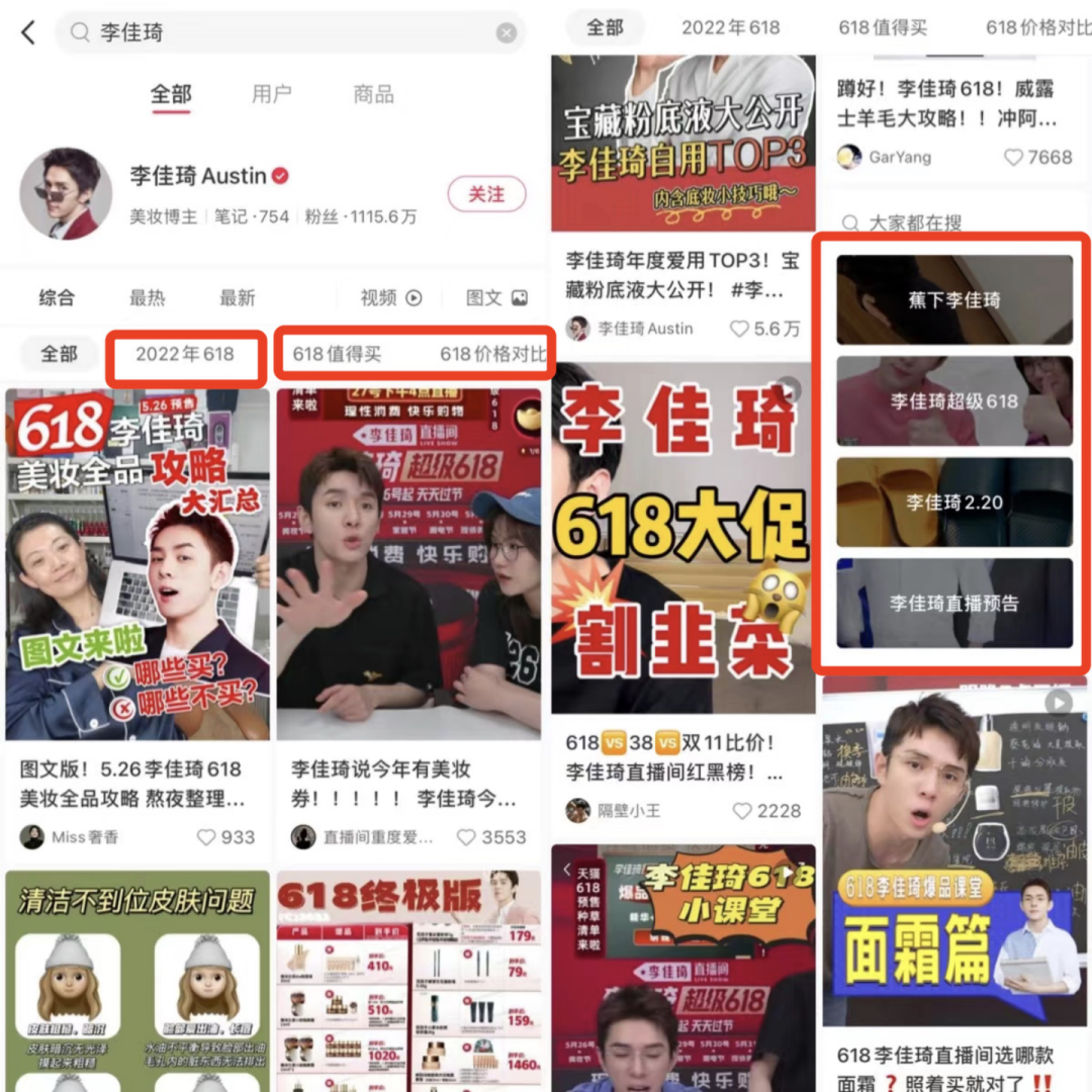 对李佳琦来说,小红书博主们在618大促前,掀起的一波“李佳琦直播间618价格对比”潮流,更是为李佳琦618助势。