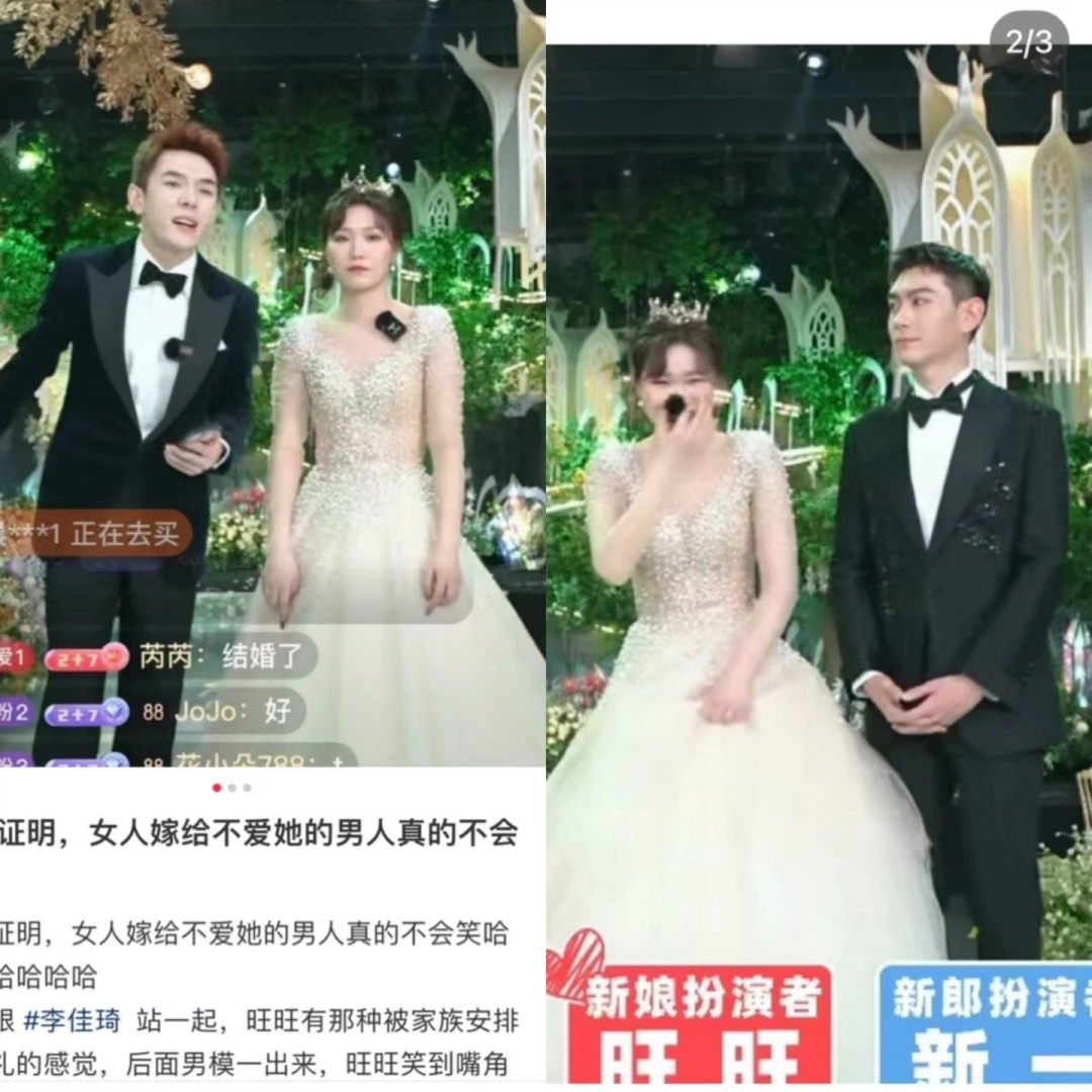 旺旺的出圈则来自于3月1日李佳琦直播带货的婚庆专场。“原来女人嫁给自己不爱的人真的不会笑”这句话搭配旺旺的表情火遍小红书和抖音。当晚,旺旺身穿婚纱,看到男模穿西装出来时,笑得嘴角咧到耳朵,但跟身穿西装的李佳琦站一起,就被网友吐槽有被家族安排婚礼的感觉。