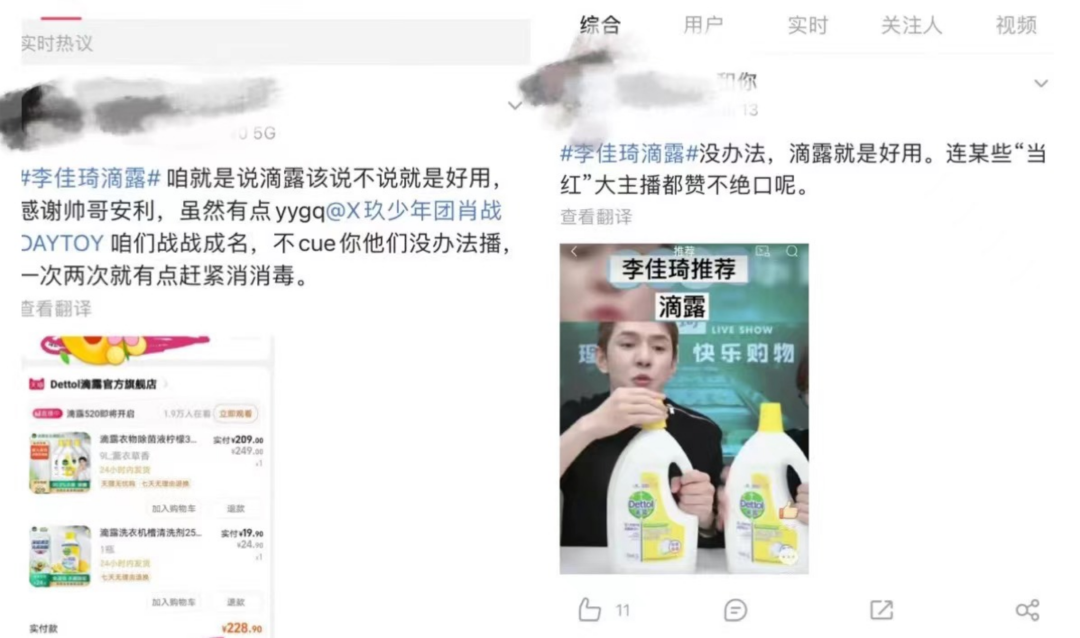 5月16日,李佳琦一边带货威露士,一边拉踩滴露。据业内人士分析,很有可能是滴露去年10月份签约肖战为代言人,没有更多成本破价给李佳琦。隔天,#李佳琦滴露#登上微博热搜,开始还有粉丝维护,不过很快评论区和热搜词条被肖战粉丝攻陷,一方面,晒出李佳琦之前带货滴露时夸赞的视频,另一方面,号召粉丝去滴露旗舰店下单,把战火烧至李佳琦直播间。