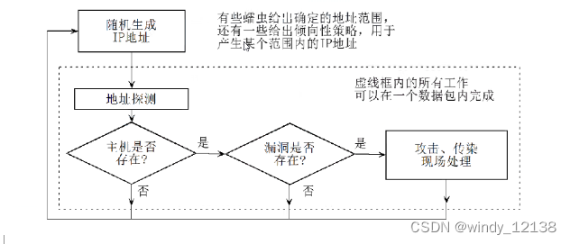 A.病毒----这是基于硬件和操作系统的程序,具有感染、传播、破坏的能力, 被感染的机器被称为宿主(和寄生虫一个样子),宿主既是病毒传播的目的地, 又是下一次感染的开始的地方。 病毒感染的目标:首先是硬盘分配表扇区,再 就是可执行文件,命令文件等。 病毒的传播的原理(过程): 当计算机运行感染病毒的程序时,病毒夺取控制权;寻找感染的突破口;找到突 破口,并且将病毒程序嵌入到感染目标中。计算机病毒的感染过程和生物病毒感 染过程十分相似,寄生在宿主程序中,进入计算机并且通过操作系统和宿主程序 的运行,复制自身、大量繁殖。 主要传播方式:感染文件传播。 B.蠕虫----蠕虫病毒主要是通过网络使恶意代码在不同设备中进行复制、传播和运行恶意代码。它是一个能传染自身复制到另一台计算机上的程序。  原理:  传播方式:通过网络发送攻击数据包 C.木马----木马是攻击者通过欺骗方法在用户不知情的情况下安装的。木马系统软件一般由木马配置程序、控制程序和木马程序(服务器程序)三部分组成。