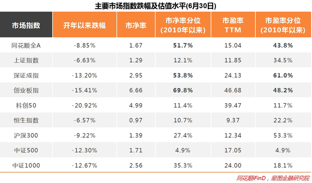 截至2022年6月30日,同花顺全A开年以来累计下跌8.85%,市盈率和市净率分别位于2010年以来的43.8%和51.7%分位,估值水平仍处于合理位置,但已难言低估。