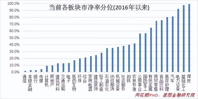 首先看一下估值水平。从2016年以来的市净率分位看,当前A股各行业分化很大。煤炭、基础化工、电力设备、汽车、美容护理等板块分位值均在80%以上,通信、非银金融、银行、传媒、计算机、房地产、建筑材料、交通运输、电子、医药生物等板块的分位值均在20%以下。