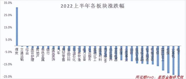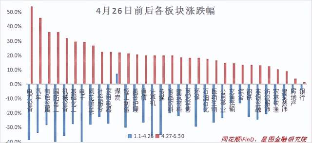 从市场风格上看,以4月26日为界限,今年上半年A股行情分为两大段。前半段,市场普跌,后半段,市场普涨,且前期下跌越多,后期反弹力度越大。银行和地产前期下跌有限,故而在4月27日以来的反弹行情中表现较差;而电力设备、汽车、军工等板块前期跌幅很深,4月27日以来反弹力度位居前列。其中,只有煤炭板块是个例外,前后两段均实现绝对正收益。