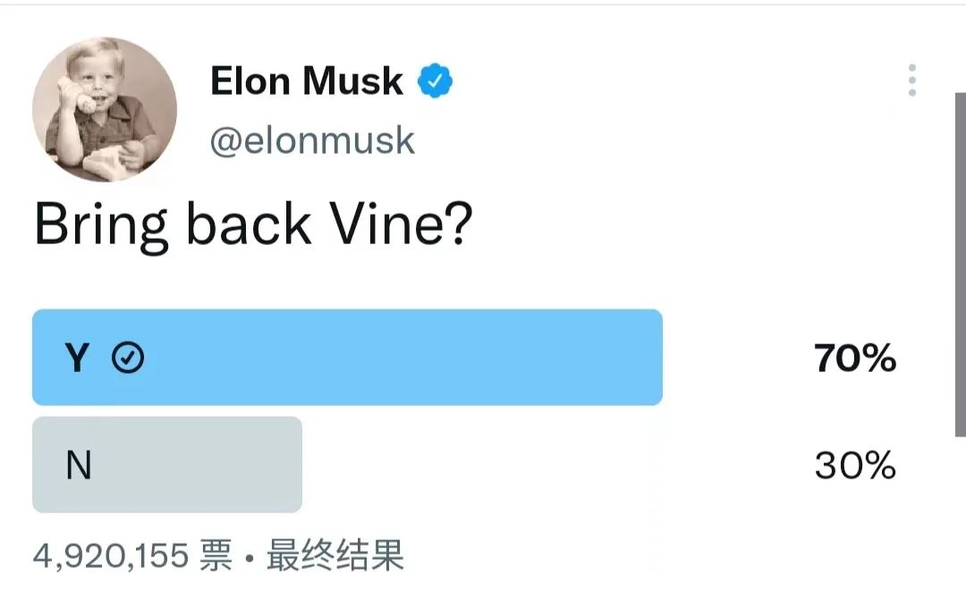 马斯克还在推特发起了一项民意调查,询问用户他是否应该重启短视频应用Vine,有接近500万用户参与了该项投票,其中70%的用户投了赞成票。