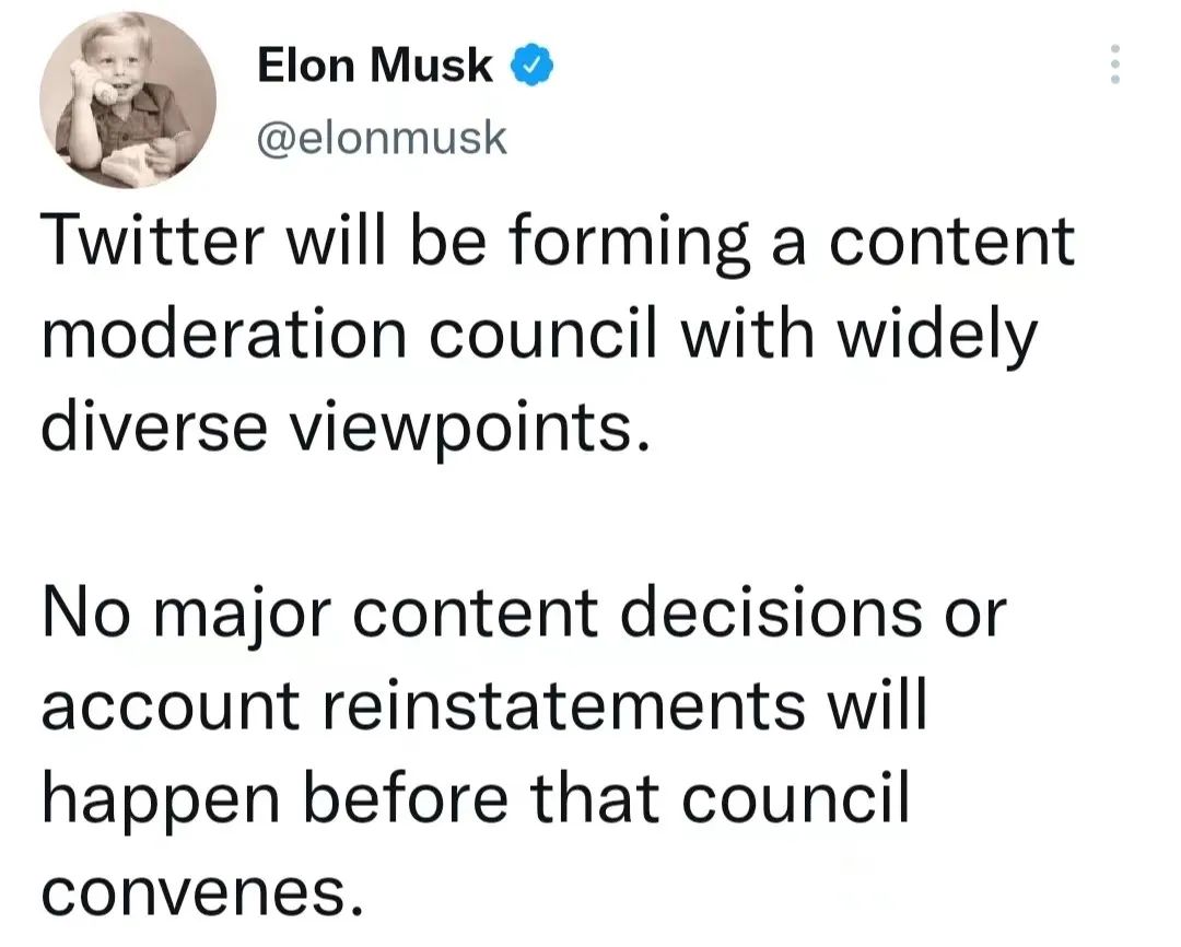10月29日,马斯克发布推文称:“推特将组建一个拥有广泛不同观点的内容审核委员会。在该委员会召开会议之前,不会发生重大的内容决定或账号恢复。”