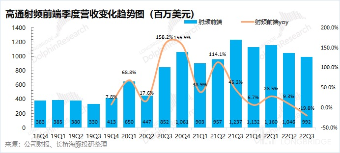 高通的射频前端业务长期占有 1 成左右的份额,本季度两位数下滑的表现,主要是受整体手机市场和 5G 换机渗透率的影响。
