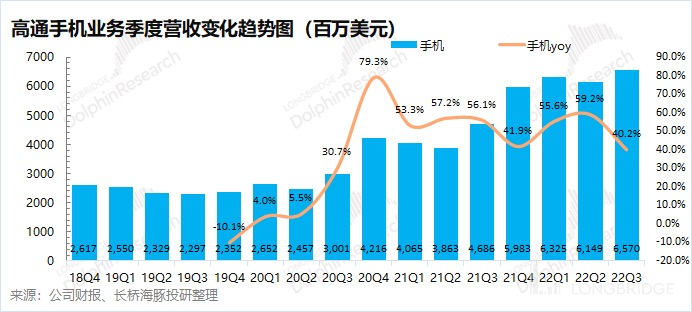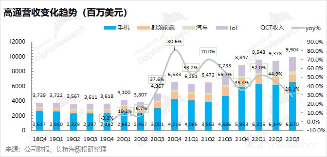 QCT 业务中的手机部分,主要是包括智能手机领域的芯片(但不包括射频前端部分)。高通的智能手机芯片业务长期占据公司营收的 50% 以上,本季度也是公司增长的最大增量。