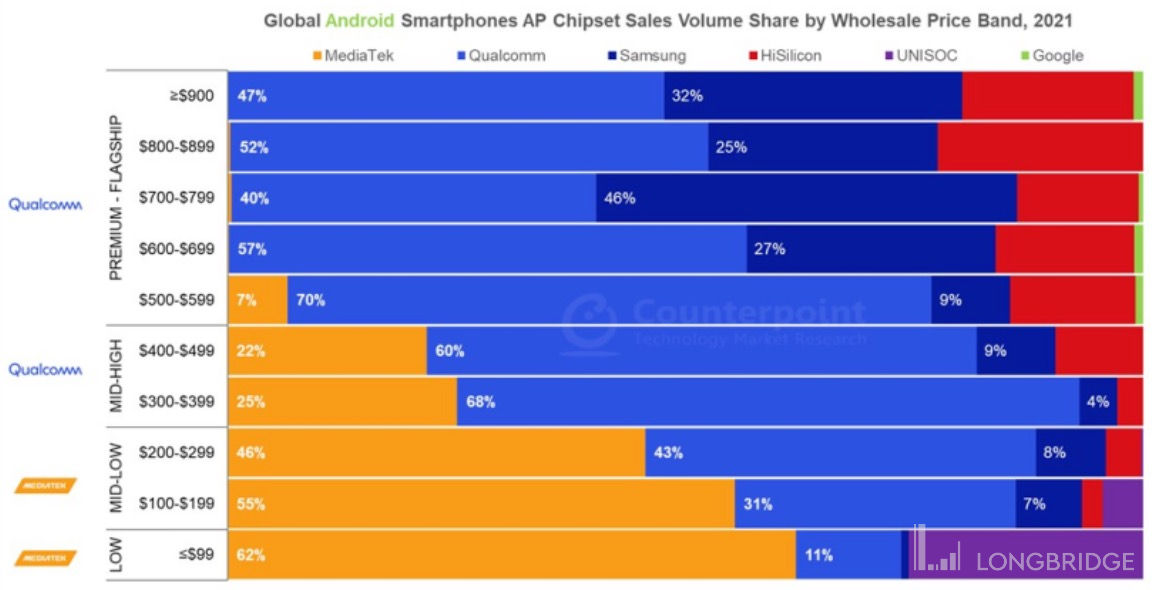 2)AP/SoC 价的维度:占据稳固的高端安卓市场。从安卓手机市场看,高通牢牢占据着中高端市场。在 2021 年安卓手机市场,高通在 300-499 美元的安卓手机市场占据 65% 的份额。类似于苹果,高通凭借 3 成的出货量,获得了市场近 5 成的收入。而在 2022 年,公司将骁龙 700 和 800 系列产品更多地打入三星的高端系列产品。高通在高端安卓手机中份额的进一步提升,拉高了公司产品的出货均价。