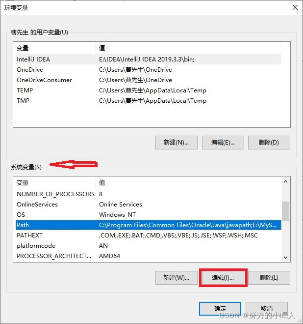 步骤4:打开【环境变量】对话框,在系统变量列表中选择path变量,单击【编辑】按钮