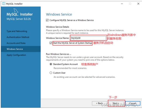 该服务名会出现在Windows 服务列表中,也可以在命令行窗口中使用该服务名进行启动和停止服务,如果希望开机自启动服务,也可以勾选 Start the MySQL Server at System Startup