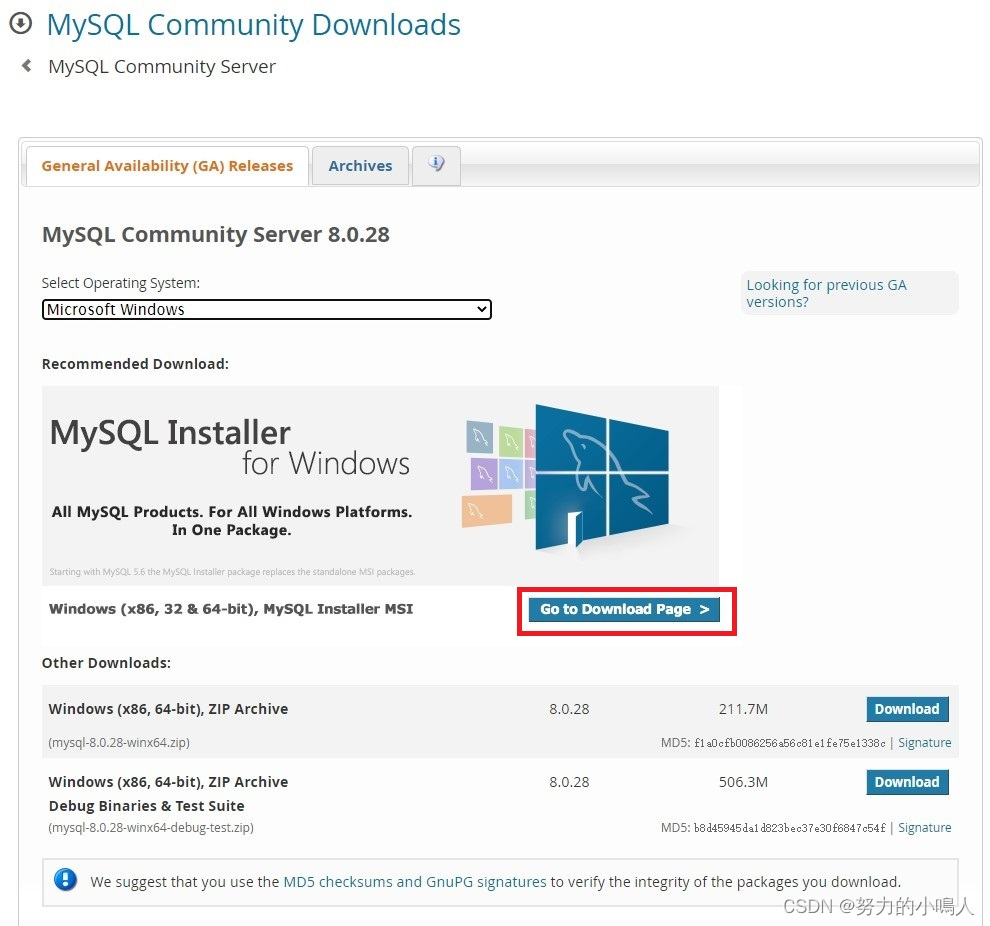 在Windows 系统下推荐下载 MSI安装程序 ;点击 Go to Download Page 进行下载