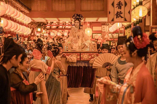 在灯火辉煌的大唐市井之中,街道两侧站满了等待表演的人们,一位身着华丽唐袍的美貌女子在众人的注视之下缓缓登上雕樑花车。花车摇摇晃晃,展示出她的摇曳生姿之态。