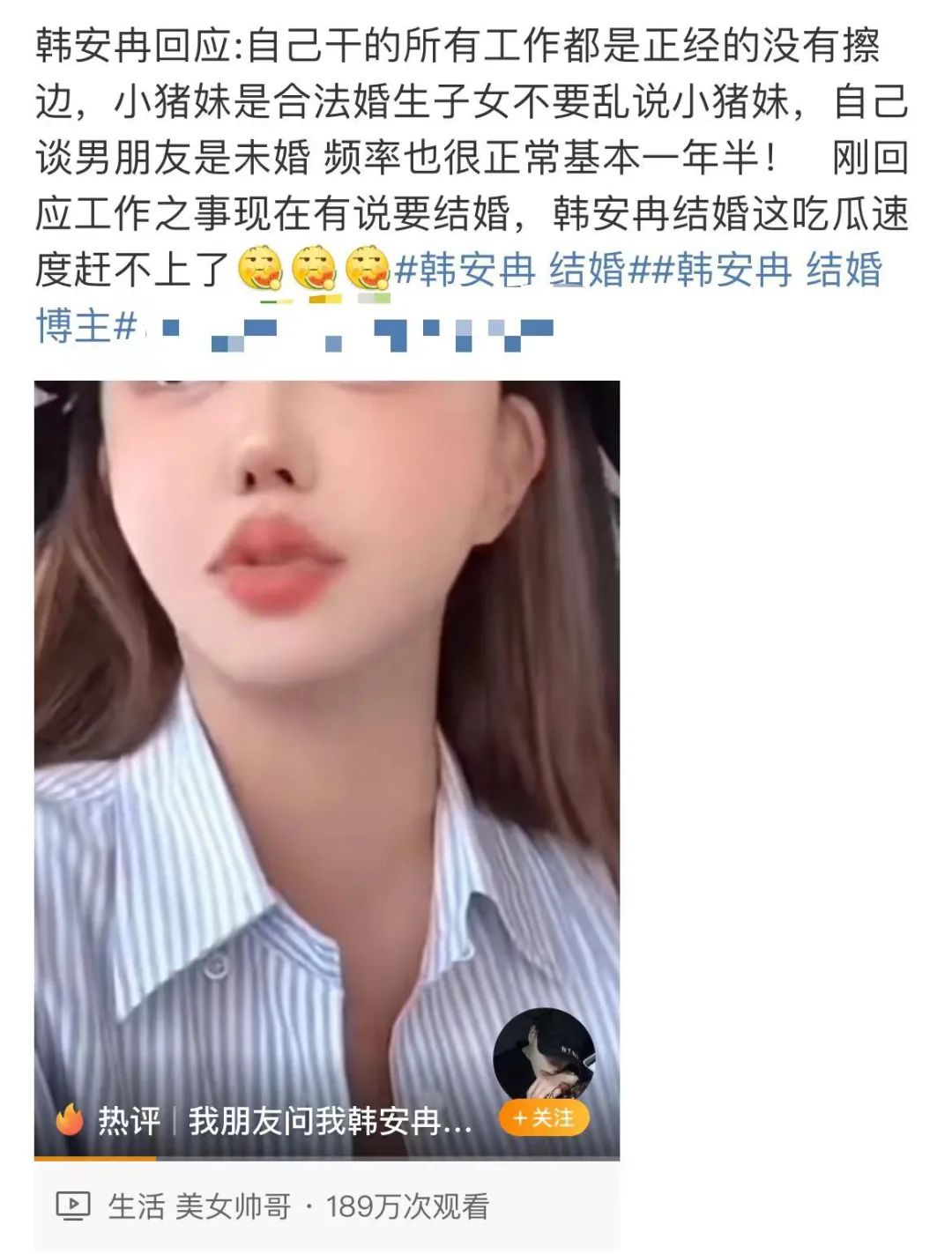 最重要的是,韩安冉的婚恋关系多而复杂,每段关系都有不同张力,闪婚、渣男、年下恋等元素单拎出来,都能被人津津乐道。青见曾跟同行分析过,韩安冉每段婚姻关系都是全员发疯,没谁能占据道德至高点。这就不存在网友一边倒的站队,这样吵起来才有意思,传播性更强。