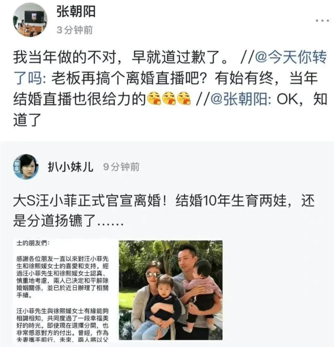2011年,汪小菲和大S在三亚举办婚礼,曾发公开信婉拒媒体报道。当时互联网巨头都想做“微博”产品,起步晚的搜狐在混战中已落下风。引流心切的张朝阳在搜狐微博直播了这场世纪婚礼,也因此跟汪小菲夫妇不欢而散,并在多年后仍是“大小恋”八卦中出镜最多的“路人”。