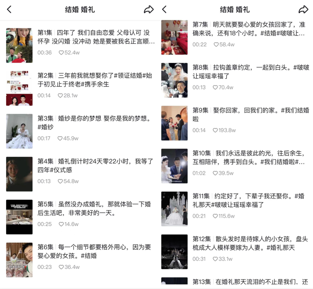在抖音搜索“结婚”,话题播放量最高达到1500亿。而翻阅具体视频,我们会发现近两年结婚的网红,多数之前运营过情侣账号。