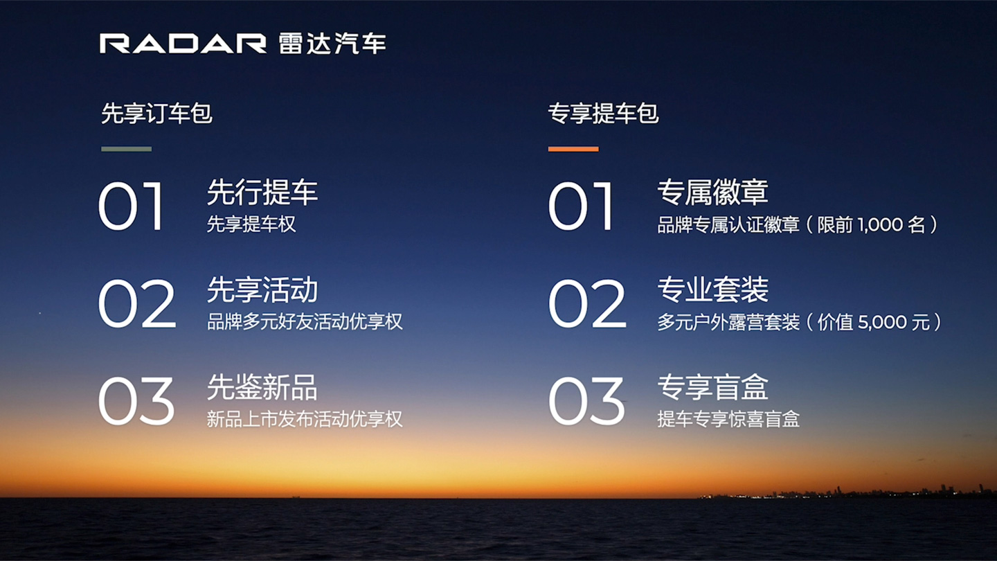无界探索,领域专注,极致多元。雷达汽车立足“新能源+多元”新赛道,聚焦用户多元生活新品类,为用户提供多元生活解决方案,希望每一个热爱自由的你,享受多元户外的你都能做自己的生活支配者,尽情去探索、去热爱、去悦享无界的自由。