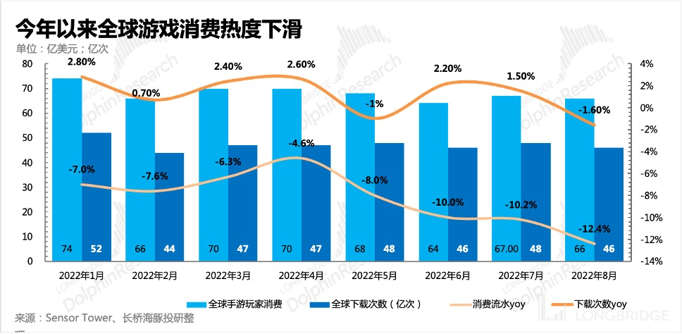 以手游市场为例,Sensor Tower 披露的每月手游数据,全球游戏付费流水呈现下滑趋势,尤其是进入 6 月之后,下滑比率进一步加大。