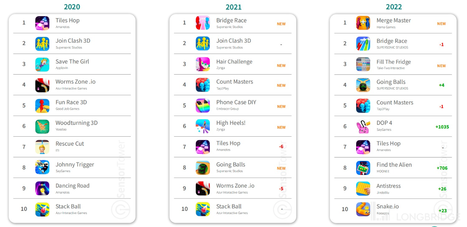 Sensor Tower 公布的年度超休闲游戏下载量排名中,头部的产品更迭速度都非常快。有新品昙花一现,也有旧品因为产品更新、运营给力而返老回春。