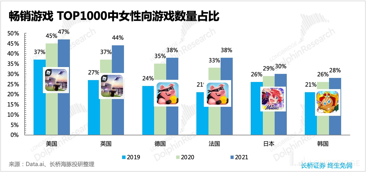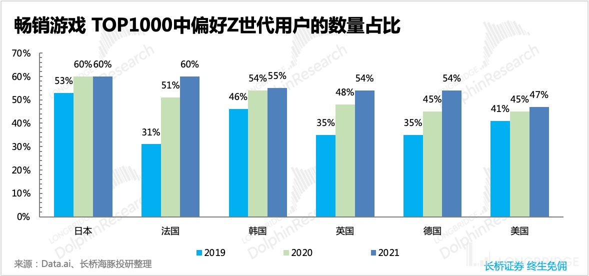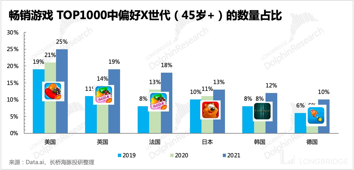 在不同的国家市场上,游戏畅销前 1000 款中偏向 X 世代用户(45 岁 +)的数量占比提升速度较快,而在疫情之前,还是 Z 世代用户的游戏增速最快。