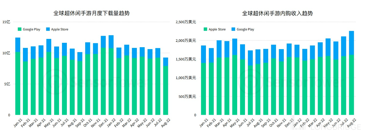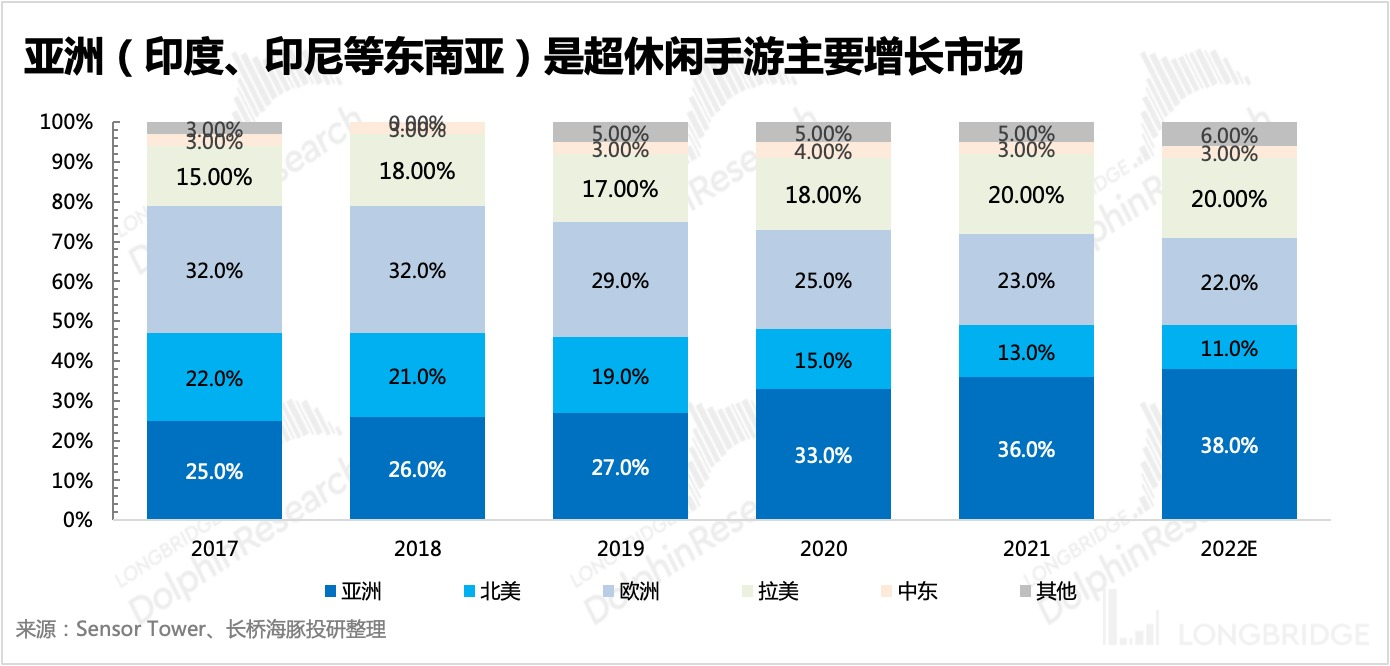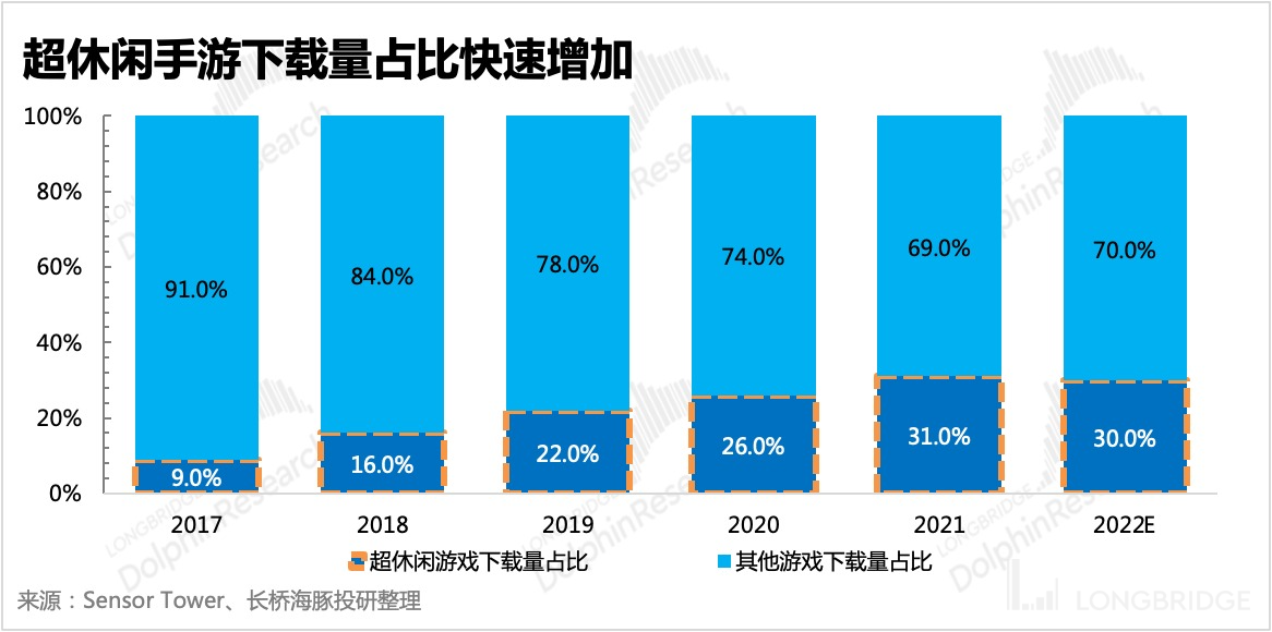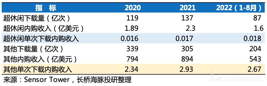 如果按照 Sensor Tower 披露的 2021 年超休闲游戏内购收入 2.3 亿美元,上述内购收入占比 5.9% 来算的话,2021 年超休闲手游整体市场规模也就是在 40 亿美元左右,只有整体手游销售收入(980 亿,Newzoo)的 4%。