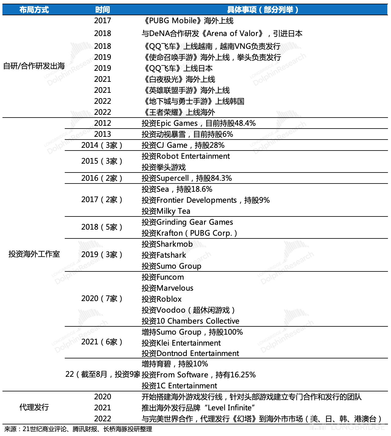 (1)2017 年之前,腾讯以投资海外游戏公司为主,并负责引进这些公司的游戏到中国大陆市场运营。在此期间,腾讯也会将一些自研游戏/收购的游戏授权海外厂商发行。比如港澳台及东南亚地区,除了本地的一些发行商外,Sea 旗下的 Garena 也是腾讯游戏在这些地区发行的重要渠道之一。