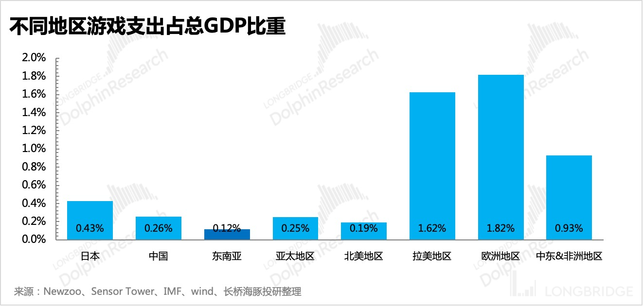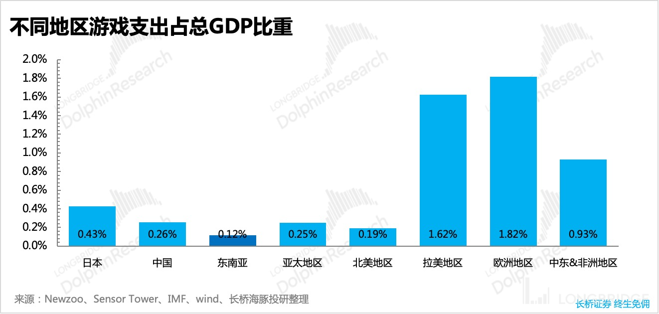 目前来看欧美、东亚地区的用户付费力最高,但与经济总量 GDP 相比,整体亚洲地区游戏付费的占比还不高,从文化习惯角度来说,东亚之外的亚洲地区(东南亚、南亚)还有更多可挖掘的付费潜力。中长期上,随着全球优秀的游戏厂商向这些地区扎堆输出产品,当地用户的游戏需求也会被进一步激发。