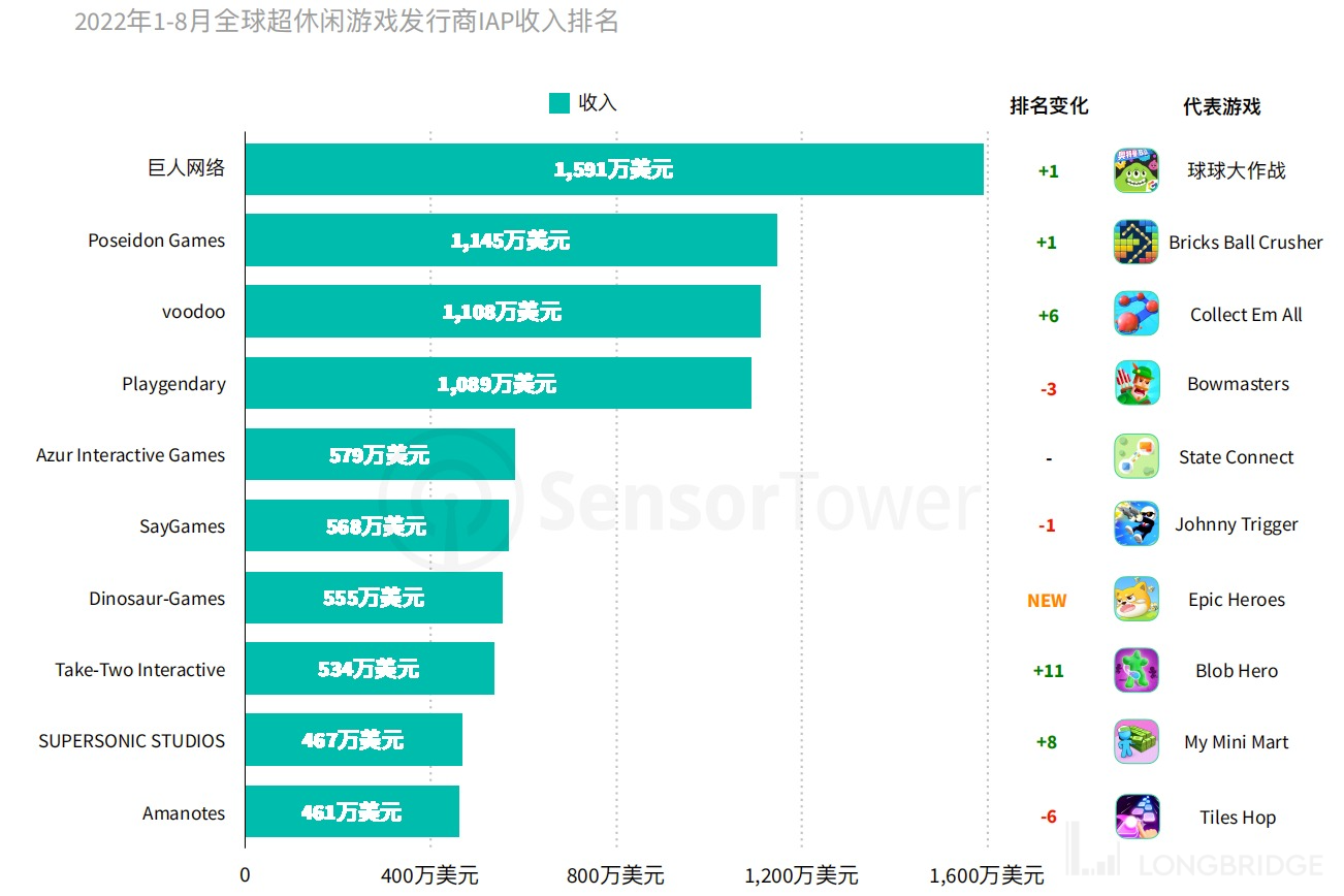 在 Sensor Tower 给出的一份 2022 年 1-8 月超休闲游戏发行收入排行榜中,排在第一位的是来自中国的巨人网络,实现收入 1500 万美元,这个创收能力还不及《暗黑破坏神不朽》上线一周的水平。因此超休闲游戏只适合中小厂,大厂的出路并不在这里。
