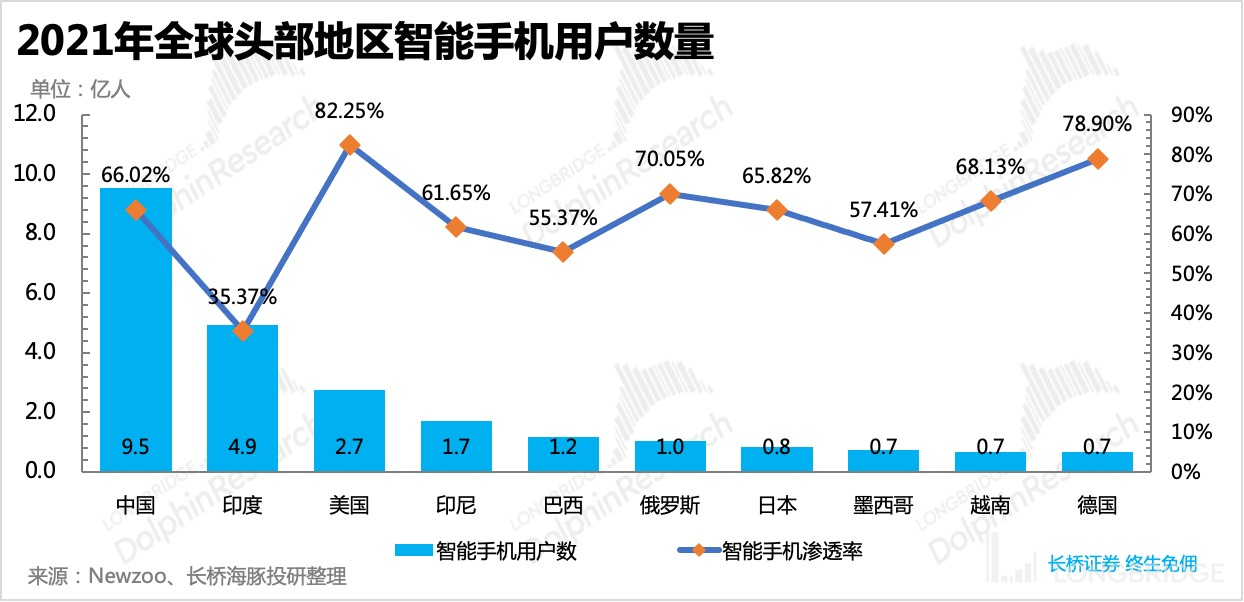 与此同时的另一面,智能手机渗透率还相对较低、且人口规模不小的印度、印尼、巴西等国家地区,整体手游市场还在高速增长;但由于人均付费水平远不及日韩、欧美,从而使得全球游戏市场呈现收入规模下降,但下载次数还在正增长的 “反差”。