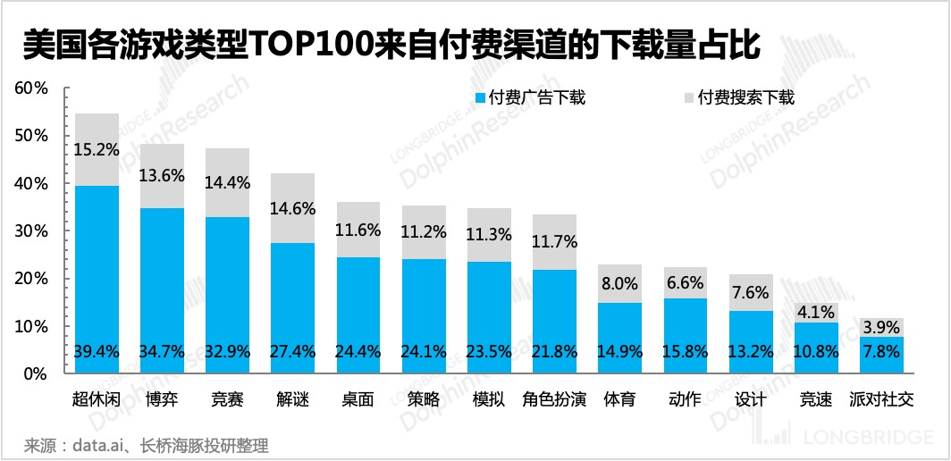 在 Unity 的游戏报告中,目前超休闲游戏 95% 的收入来自于广告,只有 5% 来自于玩家付费。同时超休闲游戏也是通过最多的付费广告获取用户,美国 TOP100 的超休闲游戏中,55% 的下载量来自付费渠道,其中绝大部分通过付费广告来获客。