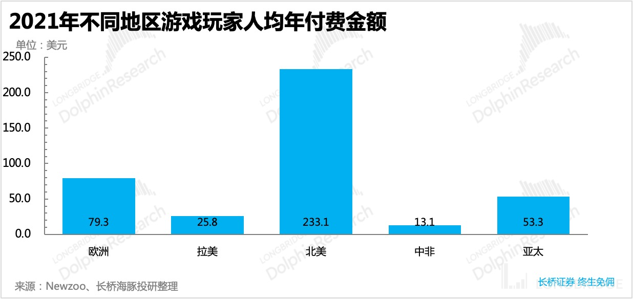 北美地区游戏支出占比也没有想象中那么高,也存在进一步挖掘的可能。但拉美、中非地区,虽然近两年增速不错,但限于居民平均收入太低,因此相当于目前的经济水平,目前的游戏市场发展相对充分。