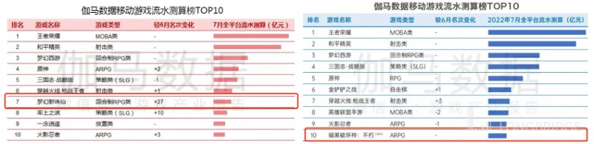 (1)一方面,二季度以来能打的新游几乎是空白,而去年同期有《摩尔庄园》、《梦幻新诛仙》、《斗罗大陆魂师对决》、《漫威超级战争》等上线初期流水亮眼的中大厂作品。《梦幻新诛仙》7 月上线,当月流水排进了 TOP10 榜。但今年同期的新游,只有《暗黑破坏神不朽》上榜了 TOP10,但排在最后一位。