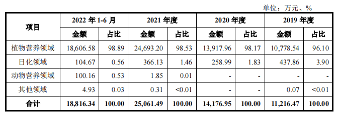 轩凯生物的业务也涉及多个领域,包括植物营养、日化、动物营养、食品等。然而,该公司产品下游应用领域还是集中于植物营养领域。报告期内,该公司产品在植物营养领域形成的主营业务收入比例分别为96.10%、98.17%、98.53%和98.89%。日化领域虽为公司产品第二大应用领域,但是报告期内,该领域的收入占比始终未能超过5%,且总体呈现下降趋势。动物营养领域方面,2022年,该领域收入规模虽有明显增长,但目前比重较低。其他领域主要包括食品领域和水处理领域等,占比还不足1%。