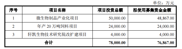 轩凯生物为逐步向动物营养、食品等领域进行拓展,计划通过本次募集资金在进一步扩大产能的同时,通过对技术研究院改扩建,完善功能微生物研究室、植物生理与营养研究室、个人护理与健康研究室、动物营养与健康研究室四大技术研发平台,以支持公司向动物营养领域和食品领域的稳步拓展。